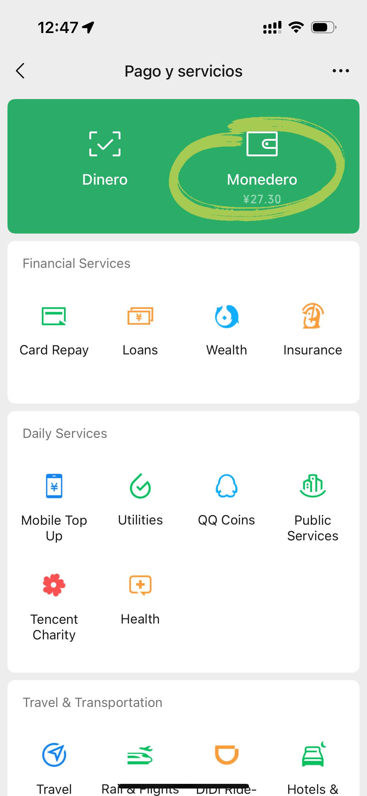 - Abre "Yo" → Pagos y Servicios → Busca "Servicios de Viaje".