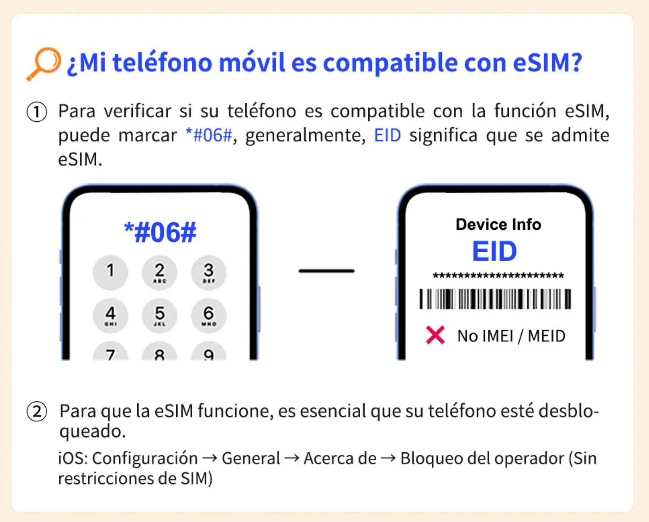 - Compatibilidad: asegúrate de que tu móvil está desbloqueado y admite eSIM.