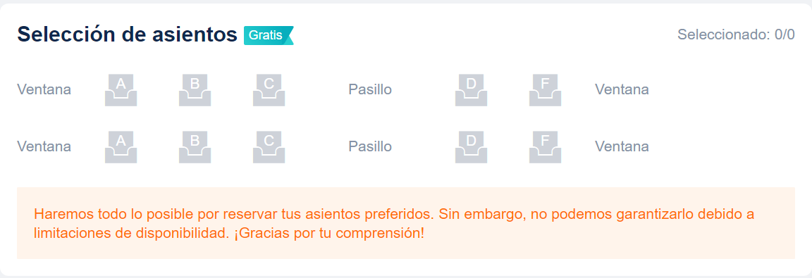 4️⃣ Elige el tipo de asiento: selecciona ventana, pasillo o asiento del medio (opciones como A, B, C, D, F).