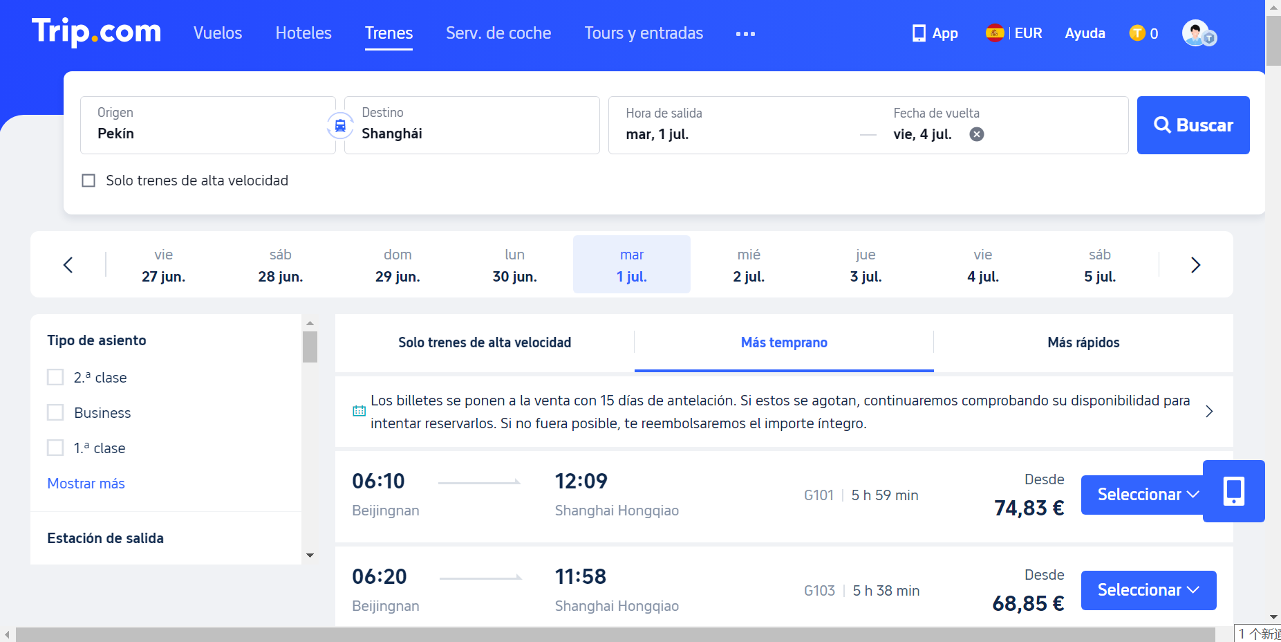 Los billetes se ponen a la venta con 15 días de antelación. Te recomendamos programar recordatorios en tu calendario, especialmente para rutas populares y en temporadas altas como el Año Nuevo Chino o las vacaciones de la Semana Dorada. - Revisa bien los datos de tu pasaporte