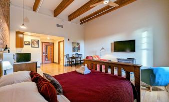 The Yamhill Flat is one of the valley's only ADA-accessible vacation rentals with a lift to access this three-floor guest room. The room is a studio-style suite with a queen bed and kitchenette. Rich, red tones in the furnishings of Yamhill tie the room to its namesake soil, and the addition of bright accents reminds us of a perfectly balanced wine. The layout and furnishings are designed to accommodate guests in wheelchairs; the comfort and style will please everyone. A large, operable window will brighten the room with light from the south; you can pull down a shade for peaceful darkness. The kitchenette is equipped with a small dining table, a French press featuring Caravan Coffee, a mini refrigerator, a microwave, and an electric stovetop. A BBQ grill on the shared patio ensures that you will have everything you need to prepare meals.