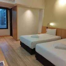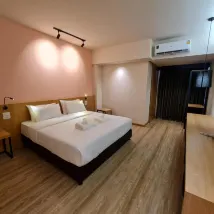 Recepción amistosa. No se necesita depósito. Equipajes guardados colocados abiertamente cerca del área de recepción. Presuma seguridad 24 horas al día, 7 días a la semana. Barrio ocupado. 7-11 y muchas otras tiendas cercanas. La limpieza de la habitación es mejorable. No debe perderse el polvo y la suciedad en la puerta de la habitación. Se proporcionan 2 botellas de agua de cortesía y 1 rollo de papel higiénico todos los días cuando se registra el DND. Ruido de tráfico ocasional pero soportable. La cama se sentía bien, pero la almohada era demasiado suave y plana. Débil olor a cloaca del inodoro pero soportable: deje la puerta del inodoro abierta para una mejor ventilación. Aire acondicionado un poco ruidoso pero soportable. Se proporcionan zapatillas, cepillo de dientes, pasta de dientes, gorro de ducha, bastoncillos de algodón. Bonita habitación en esquina. Algo de ruido en el pasillo/ascensor es inevitable.