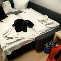 The hotel room was bright and clean. We had a double bed which unfortunately was just two beds pushed together so it kept sliding apart. Housekeeping only came one day, because we stayed in the room until 10:30. Generally the hotel is okay and clean.