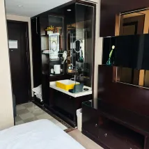 Room - stylish and comfortable. Cozy bed. Almost perfect for the price paid. Only thing I dislike is that the shower area is not completely close off so when you shower, water do get to the wash area.
