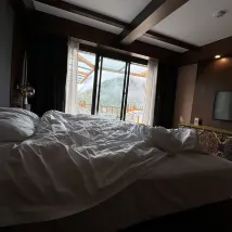 La experiencia de alojarme en el Hotel Kongshu superó todas mis expectativas. En cuanto entré en la habitación, me impactaron las montañas nevadas que se veían desde la ventana. La luz del sol se filtraba a través de la cúpula de cristal hacia la terraza, y la luz y la sombra eran tan moteadas que parecía como adentrarse en un bosque de cuento de hadas. El diseño de la habitación combina ingeniosamente elementos naturales con la comodidad moderna. Los muebles de madera tienen una textura cálida. Al abrir la ventana, se puede ver vegetación por todas partes, e incluso se percibe un ligero aroma a hierba y madera en el aire.
