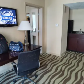 Los muebles estaban muy rayados y dañados. La alfombra estaba casi gastada. La tela de la silla del escritorio estaba gastada e incluso los botes de basura estaban oxidados por dentro. En general, la habitación necesitaba ser remodelada. Limpiaron mi habitación una vez después del primer día de una estadía de cinco días. El personal de limpieza no vino hasta las 2:30-3 pm los días tres y cuatro. Asistí a clases de capacitación y eventos entre las 9 am y las 2 pm. Probablemente no volveré a reservar una habitación en un hotel Wyndham. Debería haber tomado fotos.