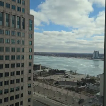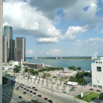 창밖으로 디트로이트 강이 한눈에 내려다보이고, 도시 야경이 정말 멋졌습니다. 특히 밤에 조명이 비칠 때는 창가에 앉아 있는 것만으로도 피로가 풀렸어요.