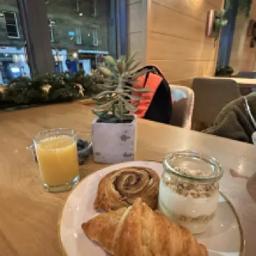 El desayuno cuesta 13 libras por persona. Desayuno normal. Buena decoración navideña y un conjunto de sofás muy bonito y acogedor para sentarse y ver las vibrantes actividades que se desarrollan fuera de los grandes ventanales. Un punto a favor.