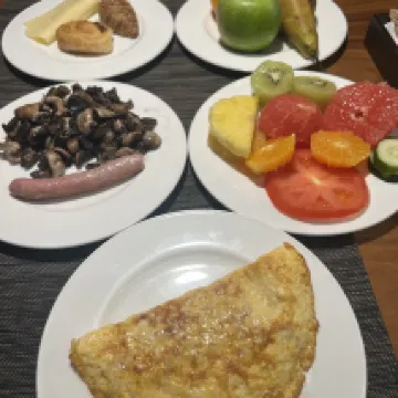 El hotel está muy oscuro. Las fotos han sido editadas mucho más claras. El número no es nada. En noviembre hay muchos mosquitos. ¡Comida muy sabrosa! El desayuno es de primera categoría. Delicioso prosciutto, salmón y jugo de naranja.