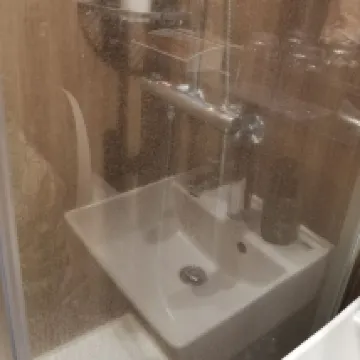 Las instalaciones son viejas, lo cual está bien, pero el cristal del baño, como se ve en la foto, es realmente pésimo. Además, la comida es mediocre. Si no fuera por su ubicación remota, habría preferido pedir en otro restaurante. Es muy inferior a otros hoteles de aguas termales que ofrecen dos comidas por noche.