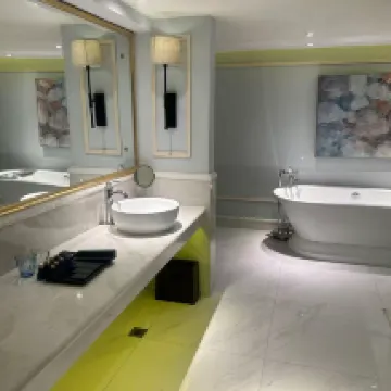 La habitación era incluso más bonita en persona que en las fotos. El hotel estaba impecable, las instalaciones eran excelentes, la distribución de la habitación era muy práctica, la ropa de cama muy cómoda y el personal muy confiable. Respondían al instante a cualquier consulta y subían cualquier cosa a la habitación enseguida. El servicio fue excepcional. El registro fue rápido y eficiente, e incluso hubo pequeños regalos para los niños al salir. Sin duda, me alojaría aquí de nuevo.