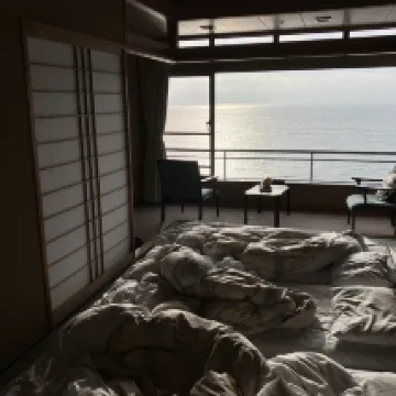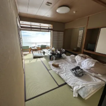 Beautiful hotel that’s located right by the seaside with unobstructed view of the sea. Outdoor onsen looks directly out to the sea and it’s amazing. Tatami was made for us already when we arrived and the mattress was thick and comfortable. We didn’t choose to have food there, and instead went out—there are several small restaurants nearby and are within short walking distance. The staff were friendly, they came out to greet us in the rain when we arrived. Highly recommend if you are visiting the area.