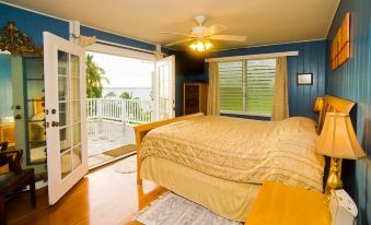 The house has a large kitchen and living room with picture windows overlooking the ocean and across the bay to Hilo Town. There is a master bedroom with a king-sized bed and french doors leading onto the deck and an outdoor shower. The second bedroom has a full and a twin bed. Each of the upstairs bedrooms has a large TV..