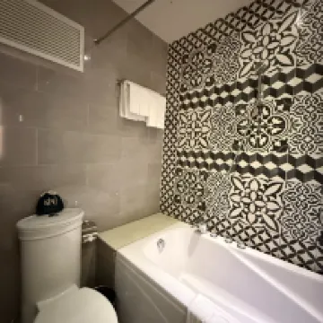 The hotel room was clean and well-maintained. However, the only downside was the bathtub/shower setup. The shower head was positioned in a way that faced the door, so when the water was turned on, it splashed onto the floor and made the bathroom quite wet.