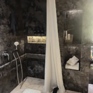 1. El ambiente era bastante normal, no tenía buena relación calidad-precio. Las instalaciones del baño eran muy deficientes: la alcachofa de la ducha no se sujetaba bien y la ducha de techo dispersaba el agua demasiado. La bañera se llenaba y el agua no drenaba, por lo que el suelo se inundaba. Además, la cortina no cerraba del todo.