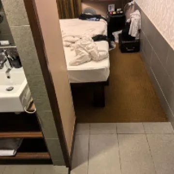 La habitación de hotel más pequeña en la que me he alojado en un viaje de negocios. El baño era tan pequeño que una persona de 70 kilos ni siquiera podía sentarse. El agua de la ducha era muy escasa el primer día. No me quedé mucho tiempo en el hotel porque asistía a una exposición. Había muchos africanos e indios alojados.
