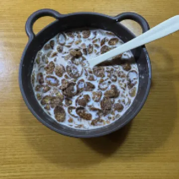 Desayuno básico con cereales y leche.