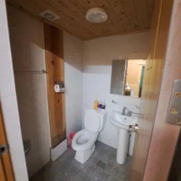 Tiene aire acondicionado y televisión (en coreano). El baño es pequeño, con inodoro y lavabo. La ducha consiste en una manguera conectada al grifo del lavabo; no es una ducha independiente, así que todo se moja y tarda muchísimo en secarse.