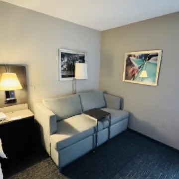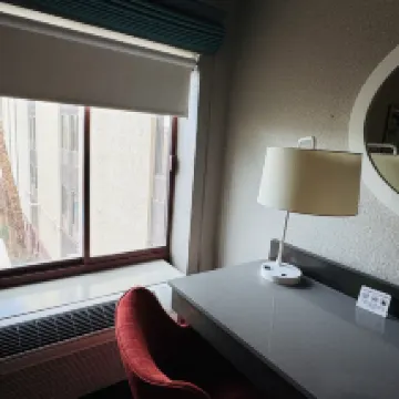 El hotel está cerca del aeropuerto, pero un poco lejos de la calle principal. Si no vas en coche, no lo recomiendo. El primer día tomamos un taxi y el trayecto del aeropuerto al hotel duró unos diez minutos. El taxímetro marcaba 21 $, pero al final fueron 33 $ con impuestos y propina. Nos pareció un poco caro. Alojarse en la calle principal es mejor; el hotel es más caro, pero está a poca distancia a pie. Si vas en coche, puedes ir; el aparcamiento es gratuito para los huéspedes.