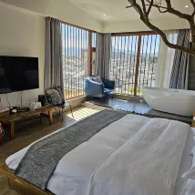 La vista desde la habitación es incomparable, muy linda, pero es demasiado alta y no es muy amigable para cargar cajas grandes. Afortunadamente, tengo un hermano pequeño que me ayuda. El desayuno son fideos de arroz con rejilla de Jiugong, lo cual está bien. Recomendado