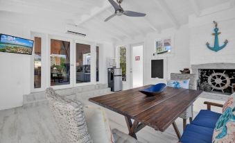 For your enjoyment, bicycles and kayaks are provided, along with a 450 lb. commercial ice machine, a fish freezer, and an outdoor cooking area featuring a gas grill and fryer (please dispose of fryer oils properly—no oils down the drain). Entertain guests at the tiki hut surrounded by beautifully landscaped grounds, illuminated by pool lighting for a romantic ambiance. Additional amenities include a laundry room, fishing poles, and a sunroom/game room overlooking the water. A safe is also available on the premises, and the cozy bedrooms open directly to the pool patio.