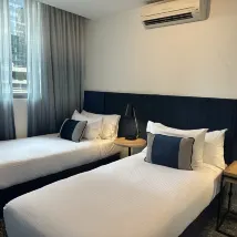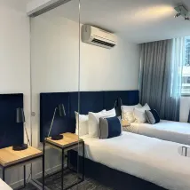 Una estancia agradable en un hotel en el centro de Melbourne. La ubicación era inmejorable: en pleno centro, con fácil acceso a tiendas, restaurantes y transporte público. La habitación estaba impecablemente limpia, moderna y bien cuidada, lo que la convirtió en una experiencia muy cómoda. Una característica destacada fue la lavadora y secadora en la habitación, lo cual fue increíblemente práctico, especialmente para estancias largas. El hotel también ofrecía wifi confiable y una cocineta, lo que aumentaba su practicidad. En resumen, es una excelente opción para viajeros que buscan un alojamiento limpio, práctico y bien equipado en Melbourne.