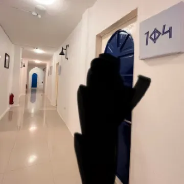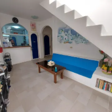 Hotel muy bonito de estilo griego, blanco y azul. Inmerso en árboles en flor. El hotel dispone de 2 plantas residenciales y acceso a la azotea. La vista desde la azotea es muy hermosa. La habitación tenía hervidor de agua, nevera, café de bienvenida e incluso té. Hay acceso constante a agua potable en una hielera situada en el suelo. La presión y temperatura del agua de la ducha son buenas. Puede secar la ropa después del mar en el patio trasero bajo el techo (protección constante para secar la ropa del sol o la lluvia). Nos gustó, la orilla está cerca. La foto muestra la vista desde la azotea del hotel.