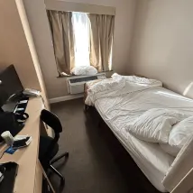 La ubicación del hotel es conveniente. Sin embargo, la habitación no está lo suficientemente limpia (incluso hay algunas manchas en las sábanas) y no queda gel de ducha en el baño cuando llego (deberían reponer todos los artículos de aseo con antelación, antes de que los clientes lleguen al hotel, lo cual me decepcionó). El personal de recepción tampoco es muy servicial. Cuando le pregunto por el problema de la máquina expendedora de aperitivos en el sótano del hotel, me dice que no es asunto suyo (la máquina no funciona correctamente; cuando intento comprar aperitivos, no salen después de pagar). Creo que el personal del hotel también debería tener la responsabilidad de cuidar todas las máquinas expendedoras. Si descubren que no funcionan correctamente, deberían avisar a los clientes con antelación para que no las usemos. Y ni siquiera nos ofrecen desayuno, aunque esté incluido en nuestros paquetes de reserva. La próxima vez definitivamente optaré por otros hoteles, con precios más razonables y mejor servicio.