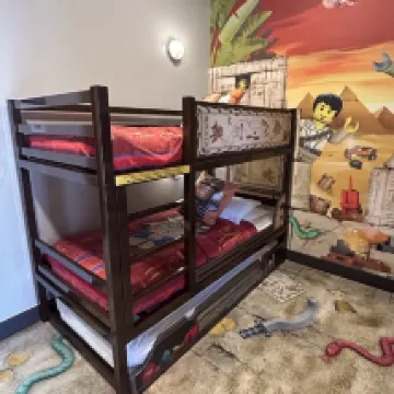 Las instalaciones son antiguas y probablemente la habitación en la que me alojo esté en la planta baja, a veces puedo ver pequeñas hormigas en la habitación. Sin embargo, a los niños les encanta la litera y el tema de la habitación. Se divirtieron desbloqueando el cofre de la habitación para obtener un juego de Lego gratis. En general, si hay una buena oferta en el hotel, puede considerar quedarse.
