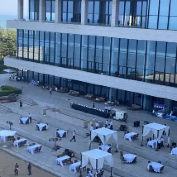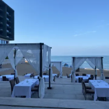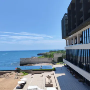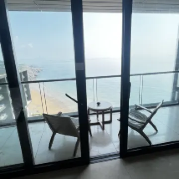 Great hotel with amazing view to the sea and huge swimming pool. We really enjoyed it. Breakfast with variety of food. Reception helped us with late check in, appreciate it so much! Beach is not for swimming, it’s not allowed, but swimming pool is pretty great.