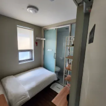 Hotel recomendable 100% por precio y ubicación. Para una persona, aunque la habitación es pequeña y no es para estar en ella, es más que suficiente. Está limpio, es cómodo, tiene secador, agua, gel, champú y acondicionador de calidad. Cama cómoda y agua con buena presion. AC y TV e internet que funciona muy bien. Localizado justo frente a la boca de metro número 10 de la estación de Seúl. Se puede ir andando además a todos lados y puedes dejar la maleta el último día. Rodeado de lugares locales y muchos restaurantes en la estación. Precio-ubicación-servicios: inmejorable