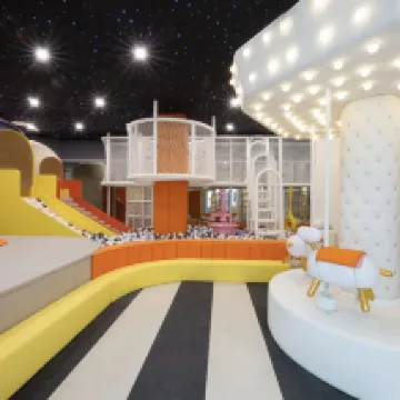 En la primera planta del hotel hay un parque infantil con toboganes, pelotas de playa y camas elásticas. Los adultos pueden tomar el té de la tarde junto a él. También hay una terraza acristalada y un bar con libros. Los grandes ventanales son luminosos y los rincones están impecables. También hay consolas de juegos infantiles y una máquina expendedora de helados junto a él, lo cual es muy práctico.