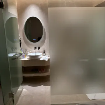 The bathroom was new, but the shower had one temperature, SCOLDING HOT. There was no way to change the temperature. The service, especially the young man at the front desk was very helpful and went out of his way to help replace the TV TWICE, as 2 sets were broken.