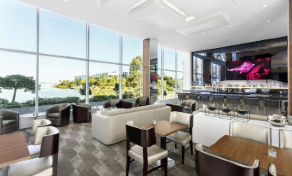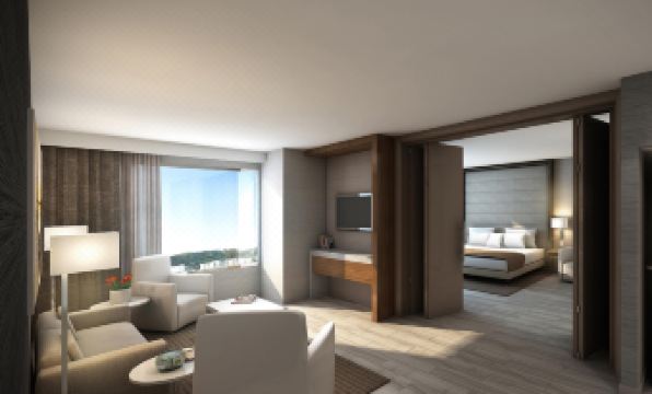 Habitación con cama extragrande y sofá cama con vistas a la bahía