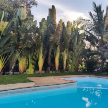 La piscina no es muy grande pero sí bonita, limpia y con zona para niños. El bungalow es acogedor, bastante grande y con todos los accesorios necesarios, TV, nevera y aires acondicionados.