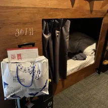 The sleeping area has bunk beds, but there’s a lack of privacy. On the second floor, there’s a gap about the width of a hand between your bunk bed and the one next to it, making it easy to hear others.
