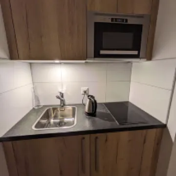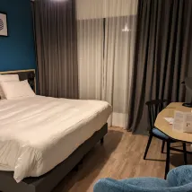 Limpio, moderno y cómodo. Un poco alejado del pueblo, pero hay una parada de autobús justo enfrente del hotel, lo que facilita mucho ir a cualquier sitio. Hay un gran supermercado al lado, al que se puede acceder a través del aparcamiento subterráneo, así que no hay que mojarse si llueve. Microondas, cocina, hervidor de agua, cafetera de cápsulas (y también café y chocolate gratis abajo). Tiene todo lo necesario. El único problema es que la ducha no tiene puerta ni nada que impida que el agua se derrame por todo el suelo del baño. Un pequeño inconveniente considerando que todo lo demás es excelente.