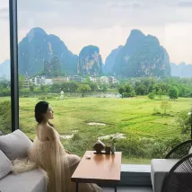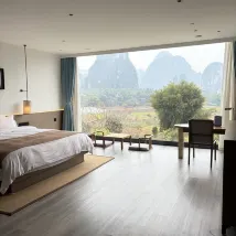 El servicio del hotel es impecable y atento, desde el té de bienvenida hasta los fideos de buenas noches. El desayuno buffet ofrece auténticos fideos de arroz de Guilin, y por la tarde, disfrutar de un té en la terraza con vistas a los campos y montañas lejanos hace que el tiempo se detenga. Está cerca de las atracciones turísticas, pero es tranquilo y sereno, ideal para relajarse y desconectar.