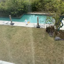 La vista de la habitación es muy buena. Hay un estanque de lotos detrás del hotel (estaba en plena floración cuando me registré) y se puede llegar al río a través de un campo. El ventanal que va del suelo al techo junto a la cama te permite despertar y ver las montañas brumosas frente a ti. Al abrir la puerta, se oye el canto de los pájaros, el canto de las gallinas y los ladridos de los perros. Por la noche, los campos se llenaban de cantos de ranas (como un coro), y de vez en cuando los dos perros se peleaban. Vi el tiempo que hacía aquí durante la semana que estuve allí.