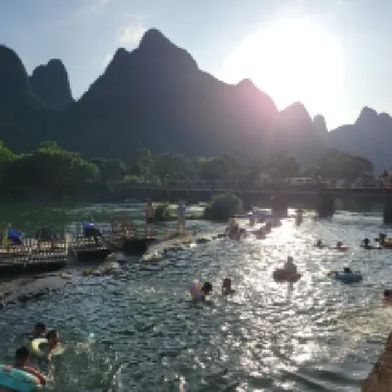 Está justo enfrente del muelle del río Yulong (¿Xiatang?). Podrás tomar una balsa de bambú al salir por la puerta. Por la tarde no es necesario hacer cola. También hay muchas casas rurales cerca.