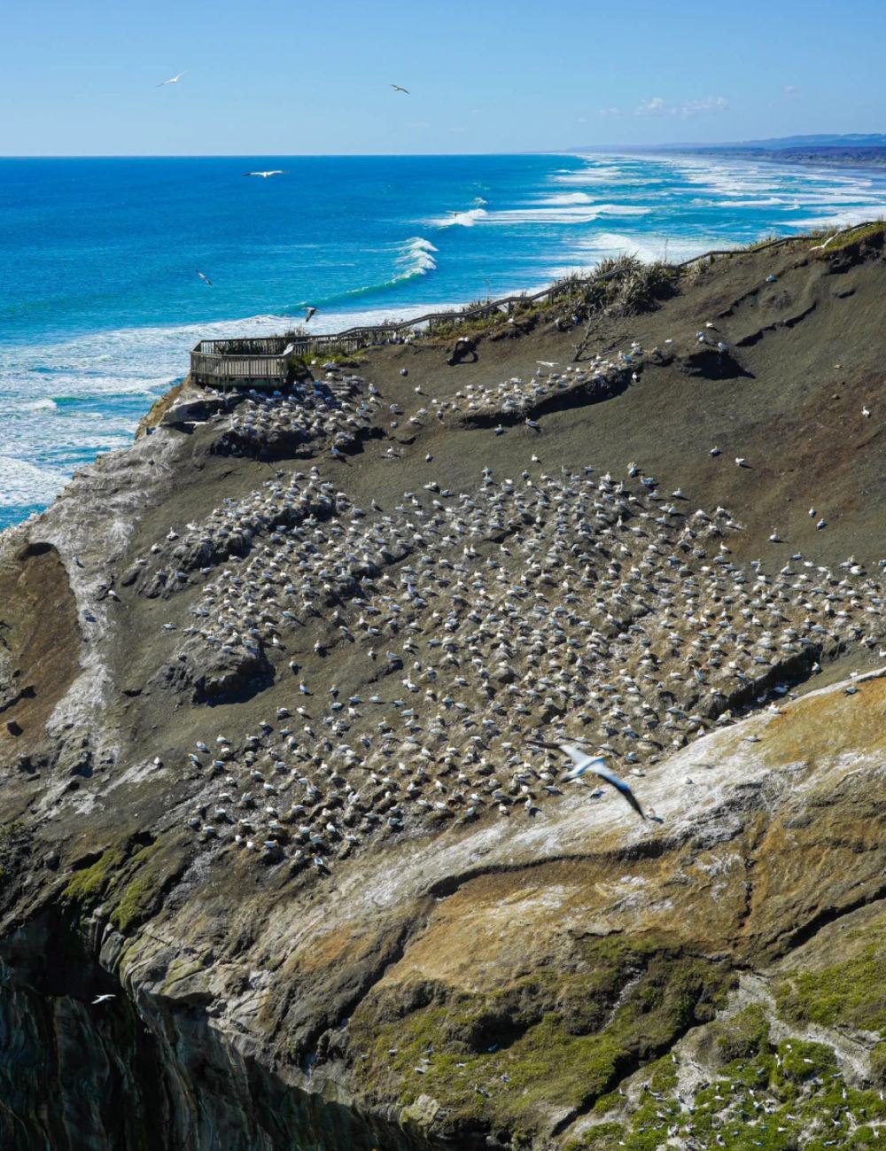 Este es uno de los hábitats terrestres más grandes y accesibles de alcatraces australianos (Gannet) en Nueva Zelanda. Cada año, de agosto a marzo, miles de estas aves llegan aquí para aparearse, incubar y criar a sus polluelos. Es un espectáculo impresionante observarlas de cerca mientras vuelan y regresan a sus nidos.