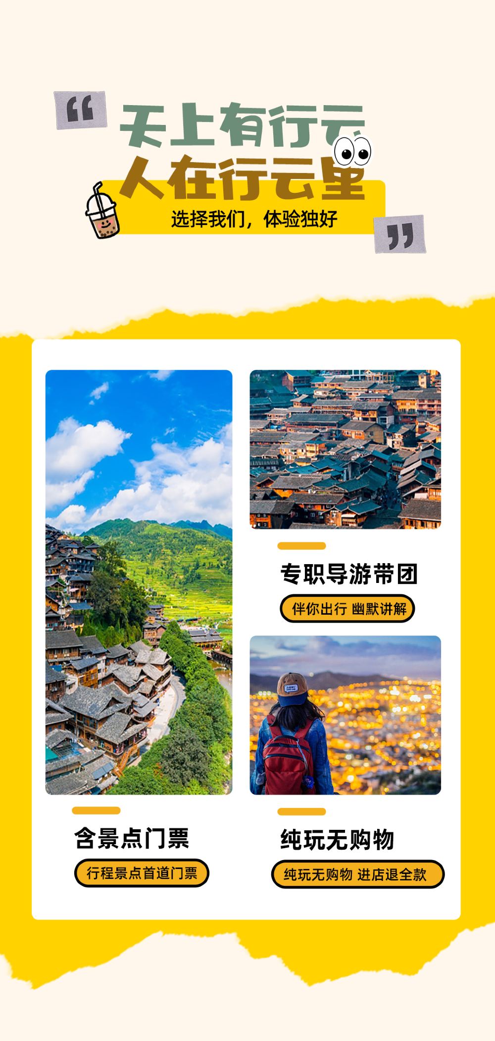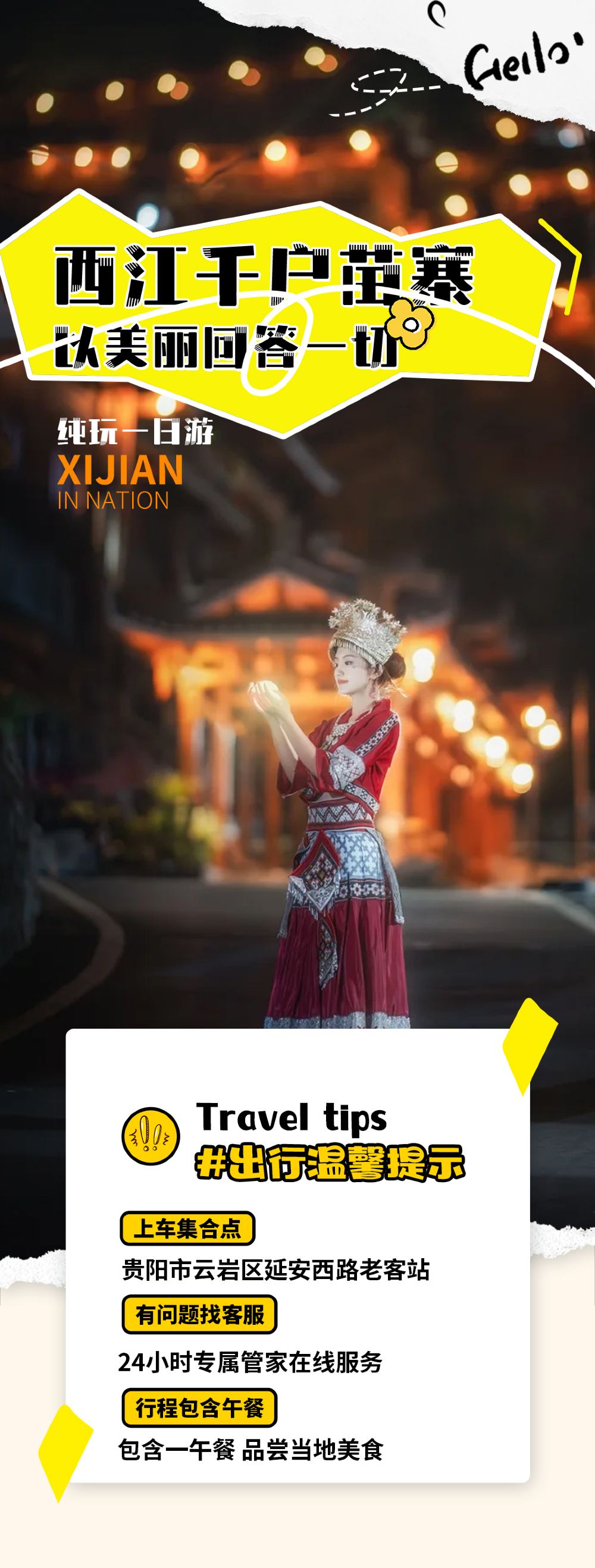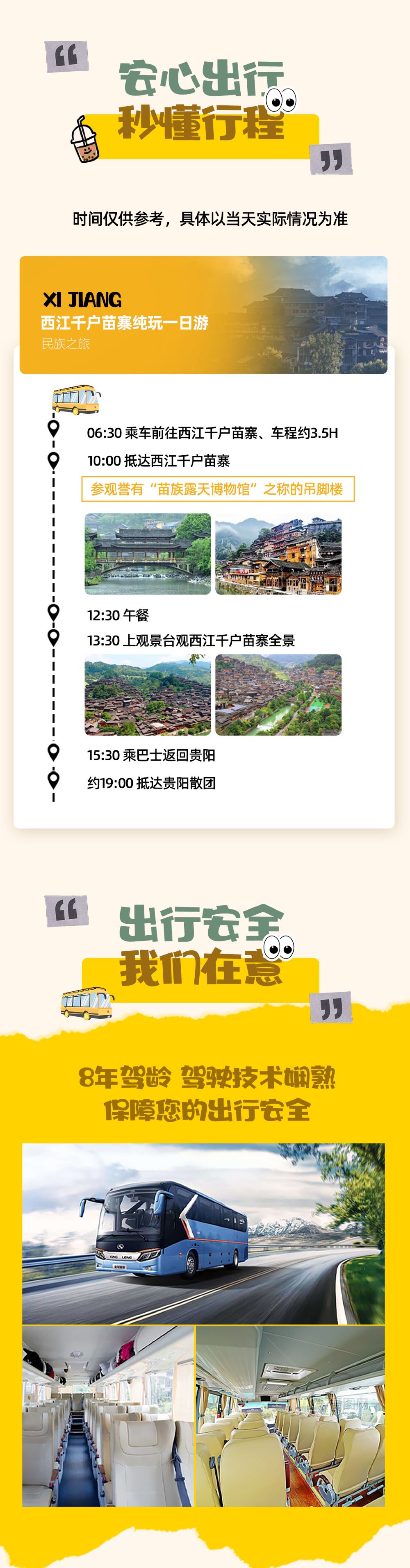 Dado que los lugar turístico de Guizhou suelen ser grandes y las familias los visitan a diferentes ritmos, para no afectar la experiencia turística de todos, el guía ofrecerá una visita guiada con explicaciones uniforme en el autobús. Al llegar al lugar turístico, todos tiempo libre, reunirse y regresar a tiempo según la guía.