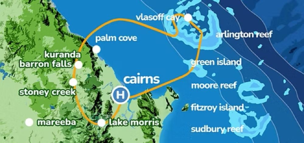 Después de sobrevolar la isla de arena, continúa hacia la isla Upolu Cay y conduce hacia el oeste, cruzando la costa hasta llegar a las playas del norte, Palm Cove y Double Island. En el camino de regreso, podrás disfrutar de las vistas del puerto de Douglas, el lago Morris, la selva tropical de Kuranda, el desfiladero y las cascadas de Barron, las cascadas de Stoney Creek, el lago Morris y la presa de la mina de cobre, así como del monte William.