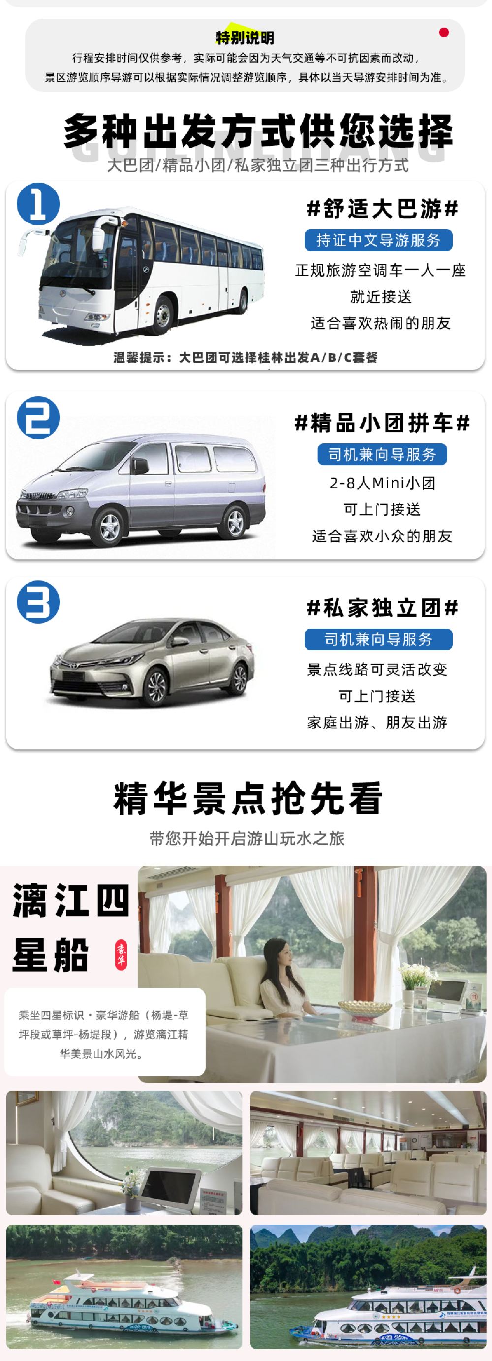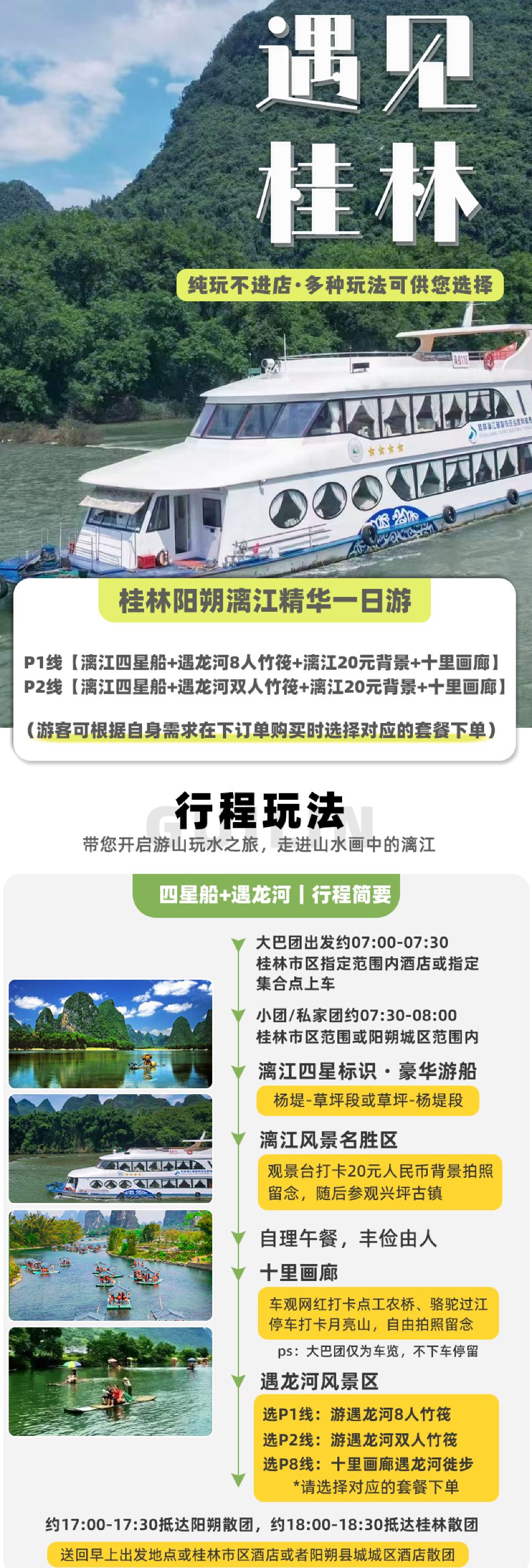 - Línea P8 [Crucero de 4 estrellas por el río Li + Fondo de 20 yuanes del río Li + Antiguo pueblo de Xingping + Caminata por el río Yulong en la Galería de Diez Li]
