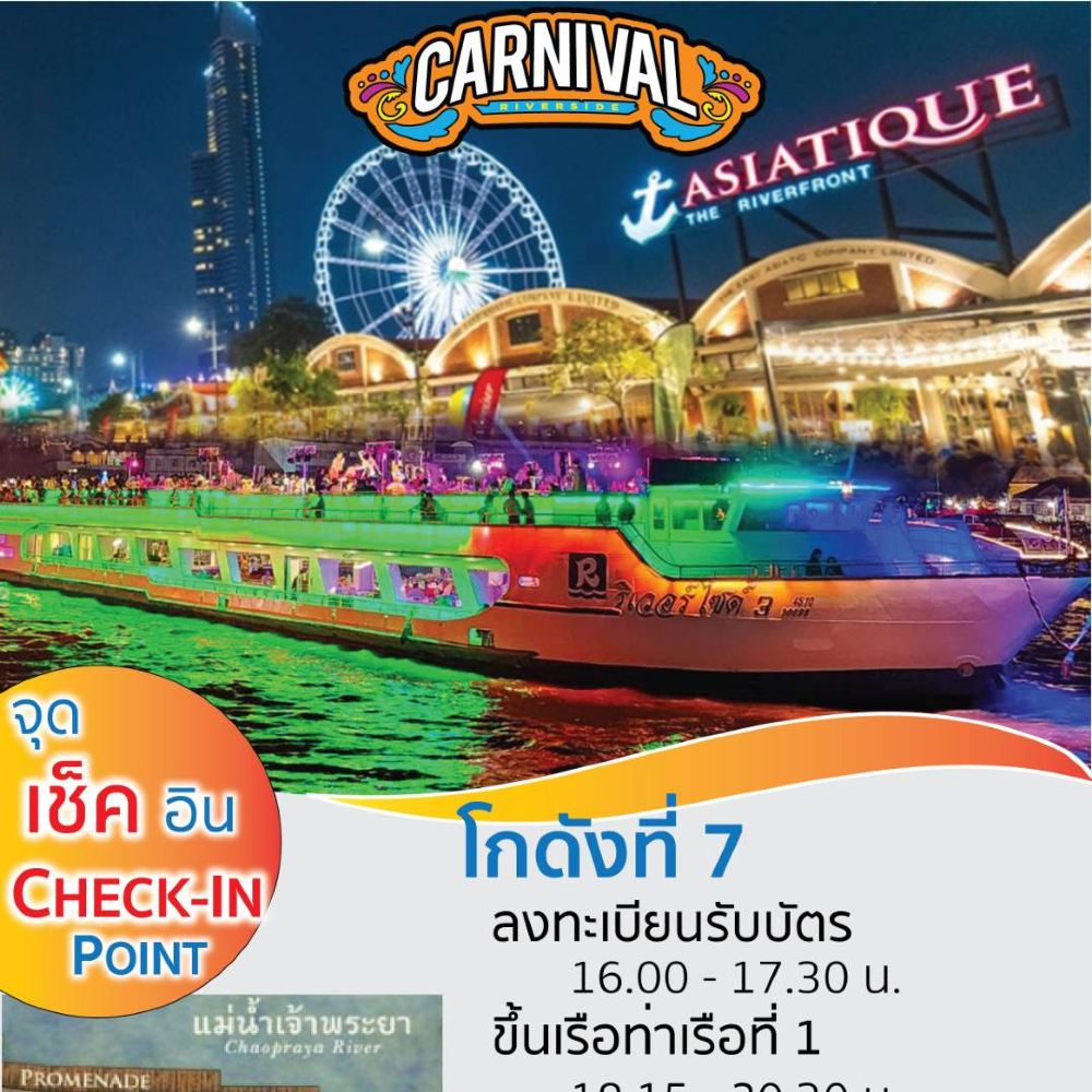 ◆◆ 15:30 -17:30: Diríjase al mercado nocturno "Asiatique" junto al río y encuentre el mostrador con el cartel "Riverside Carnival Cruise" entre las calles comerciales 7 y 8 para recoger entradas. (Asegúrese de llegar al muelle de embarque antes de las 18:00)