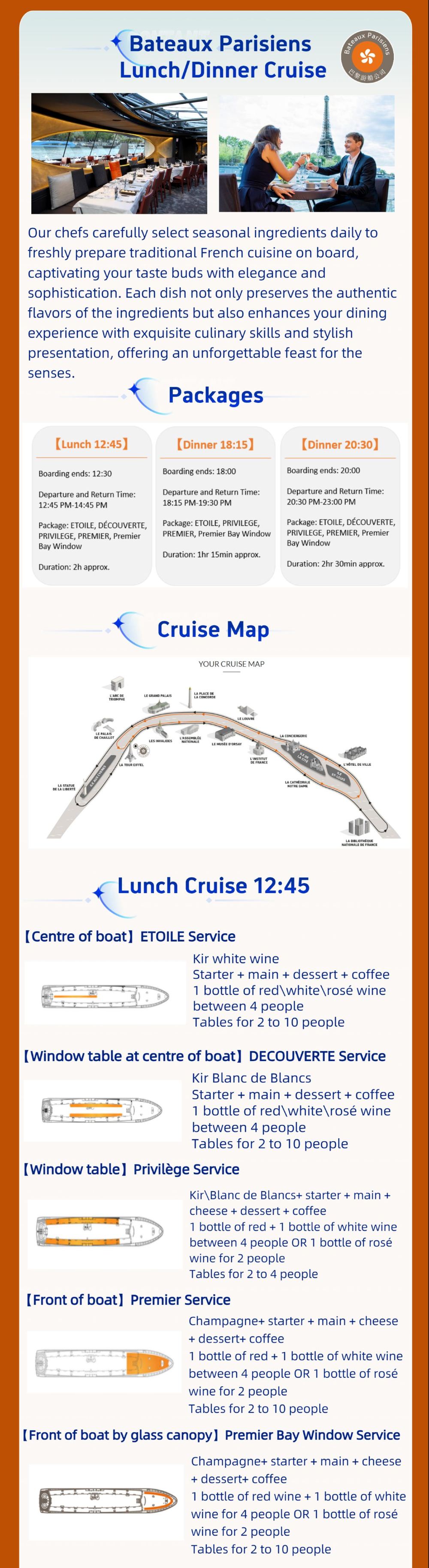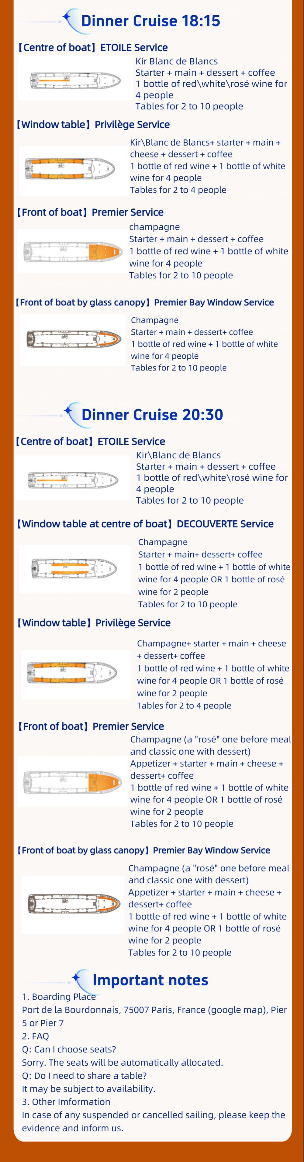 1. El horario del crucero es fijo, por lo que debes llegar al muelle con 45 minutos de antelación. El embarque finaliza 15 minutos antes de la franja horaria seleccionada. Esto significa que si eliges la franja horaria de la cena a las 20:30, el crucero dejará de embarcar a las 20:15. Si llegas después de la hora límite de embarque, no podrás participar en la experiencia ni recibir un reembolso.