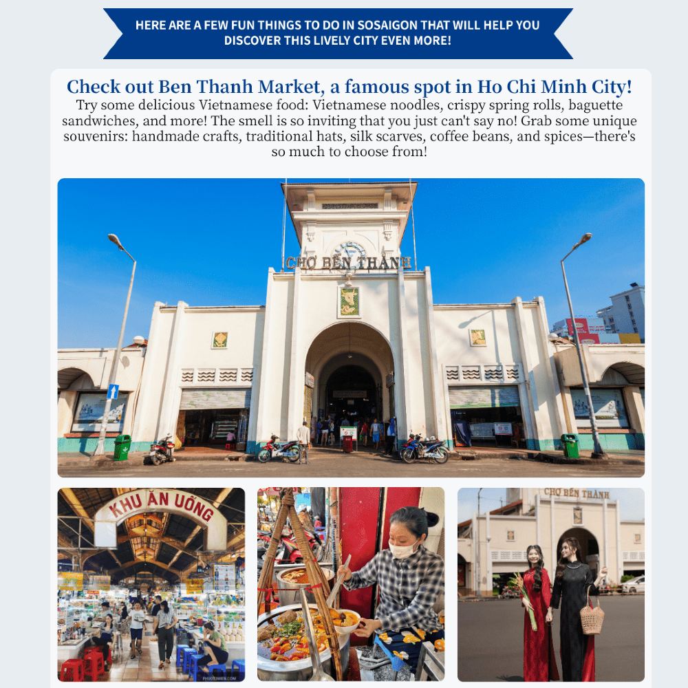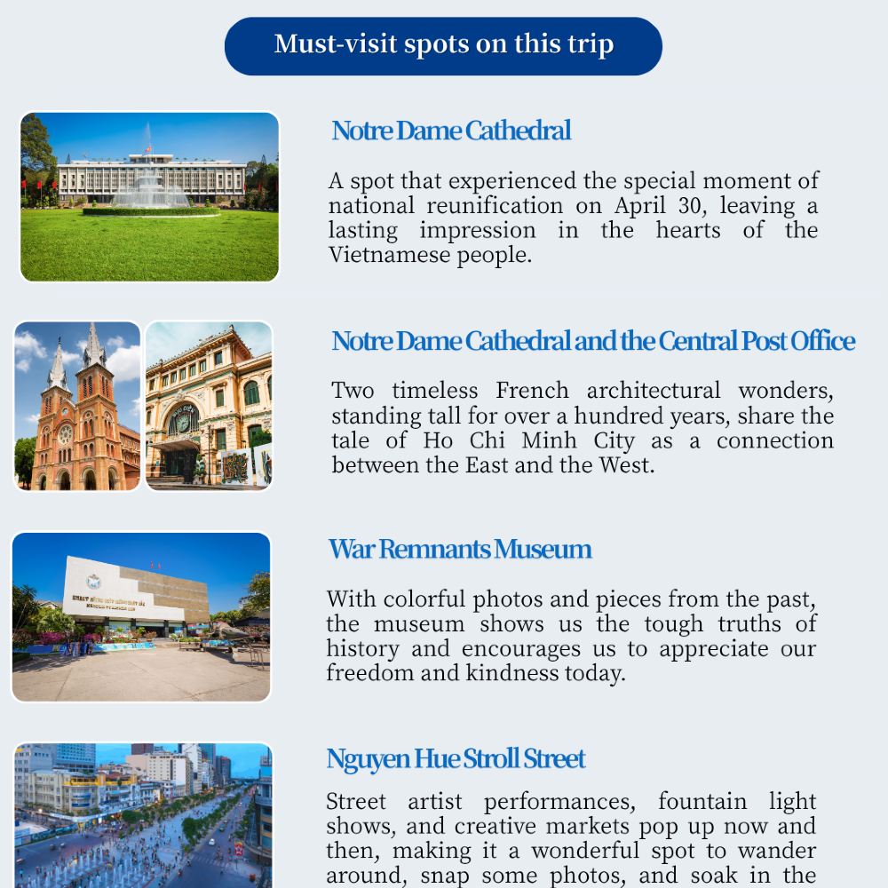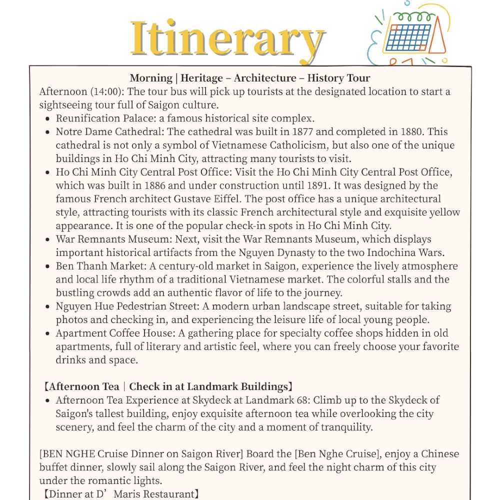 Lo anterior es un itinerario detallado para un recorrido cultural de un día por la ciudad de Ho Chi Minh, que muestra los mejores lugares de interés de la ciudad y combina experiencias culturales, culinarias y paisajísticas con un itinerario rico y relajante.