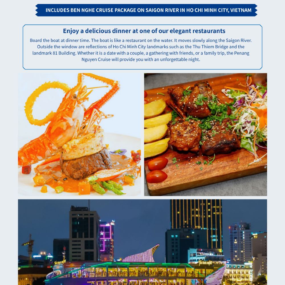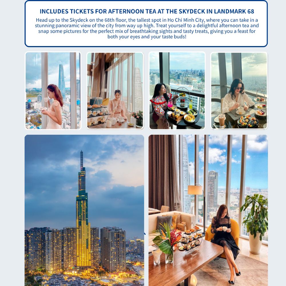 Por la tarde, subirá al Landmark Tower Skydeck para disfrutar de una impresionante vista de la ciudad desde arriba. Disfrute de un delicioso té de la tarde y un momento de tranquilidad en Saigón. Por la noche, embárquese en un crucero en barco Ben Nguyen por el río Saigón, disfrutando del romántico paisaje nocturno y una cena buffet china a bordo, culminando así este recorrido cultural con éxito.